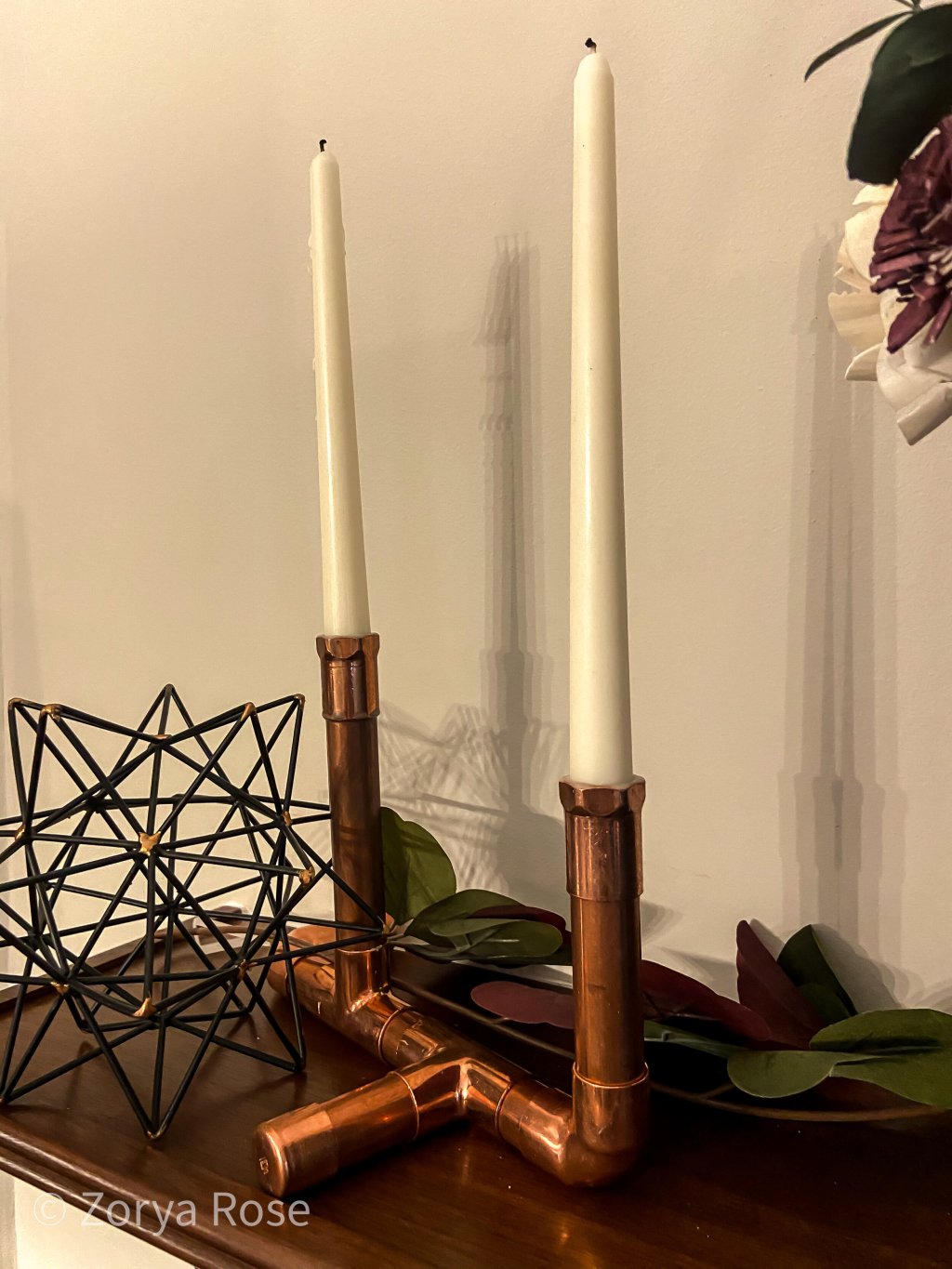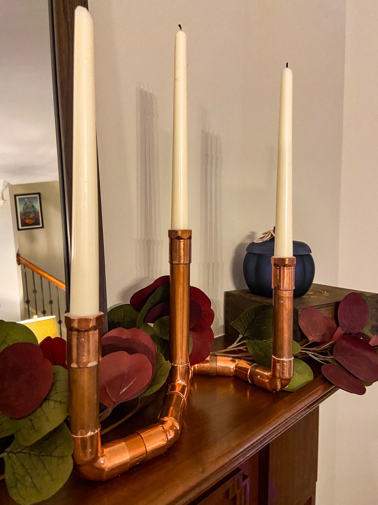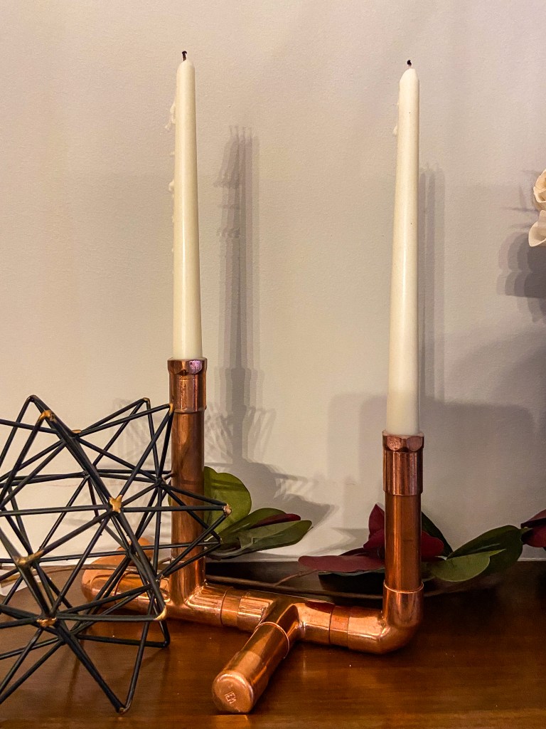 Inspired by MaCenna’s industrial décor video, I created copper pipe candle holders to complement the copper accents in our living room. Using copper pipe, fittings, and a pipe cutter, I cut the pipe to size and assembled the pieces to make a sturdy candle holder base and uprights to hold taper candles. With some Liquid Nails to secure the fittings, these DIY copper candle holders add a warm, handcrafted touch to our fireplace mantel.