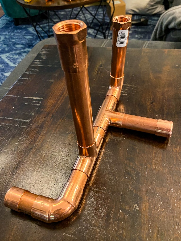 I was watching MaCenna’s industrial décor video and she showed these pipe candle holders. Our living room has tons of industrial touches, and while we have lots of iron pipe and iron accents, we didn’t have a lot that tied in the copper brackets we are using to hold up our theater components. Taking this idea but using copper pipe instead seemed like a perfect fit. I’ve linked her video right here in case you also love industrial décor like we do!