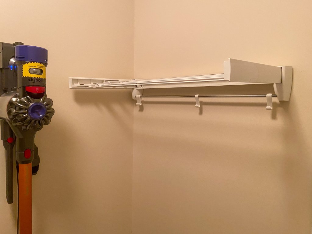 This drying rack was already in the room, but when it was open to hold laundry, it bumped into the door. I went ahead and removed it since it wasn’t the best fit for our laundry. Also in the laundry room, we have this smart closet that is basically the main connection point for our internet. I have some plans for an update here too as part of the ORC.