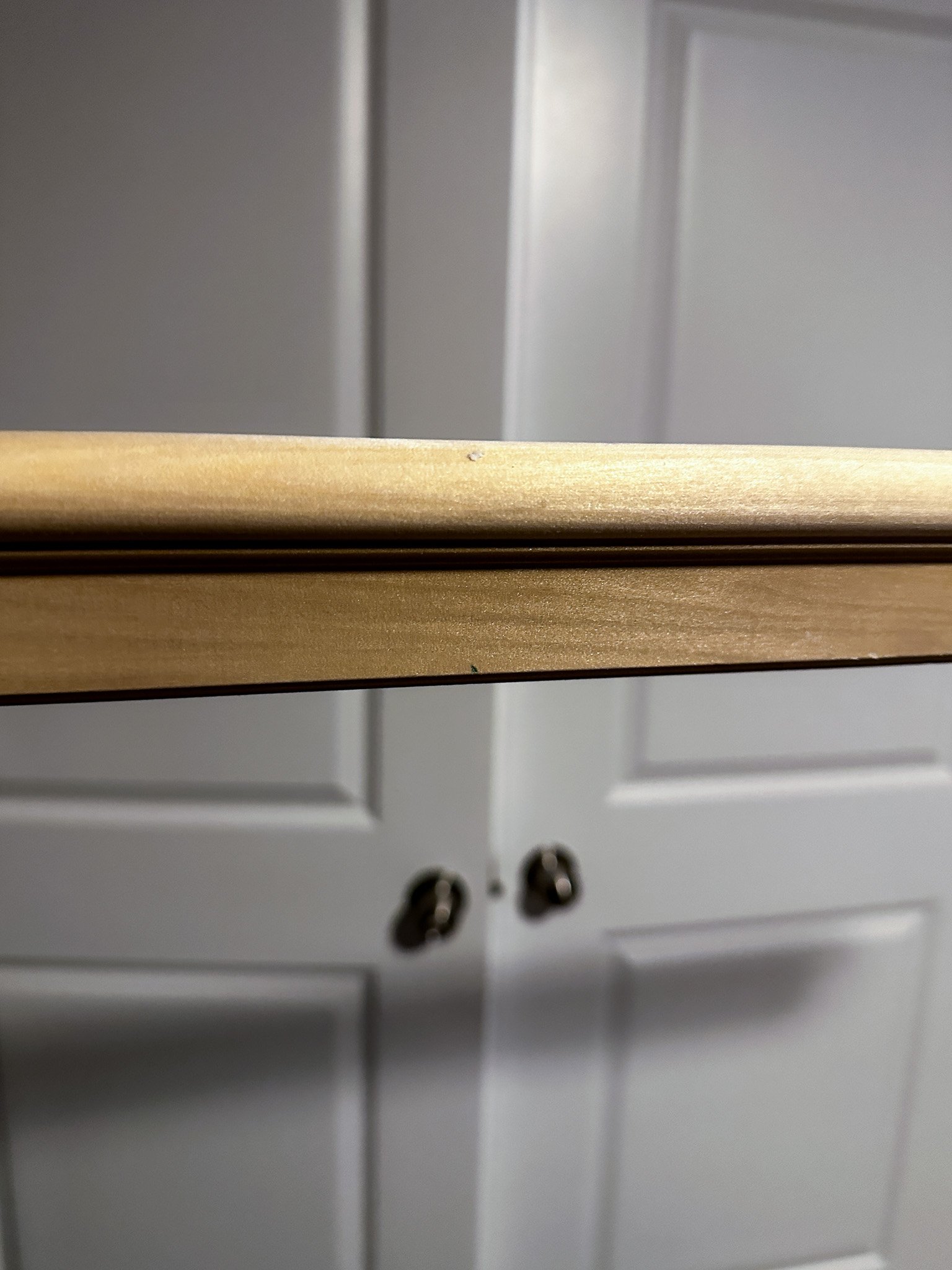 In the gym, we have windows, two doors, and the Murphy bed, all of which are at different heights. We wanted the picture rail to look like it met (or avoided) each of these intentionally, instead of only being a little bit offset. After some very scientific holding the molding up in the air to guesstimate, and then Matt doing much more scientific measuring with the laser distance tape, we decided that the bottom of the picture rail should be 20” from the ceiling.