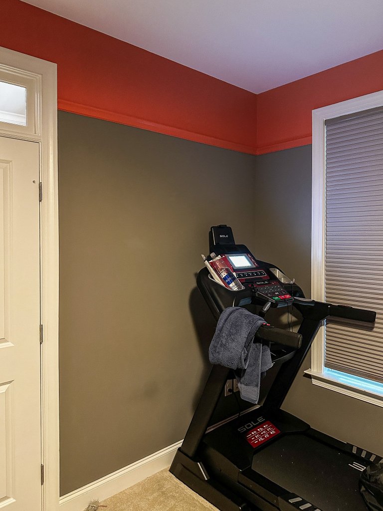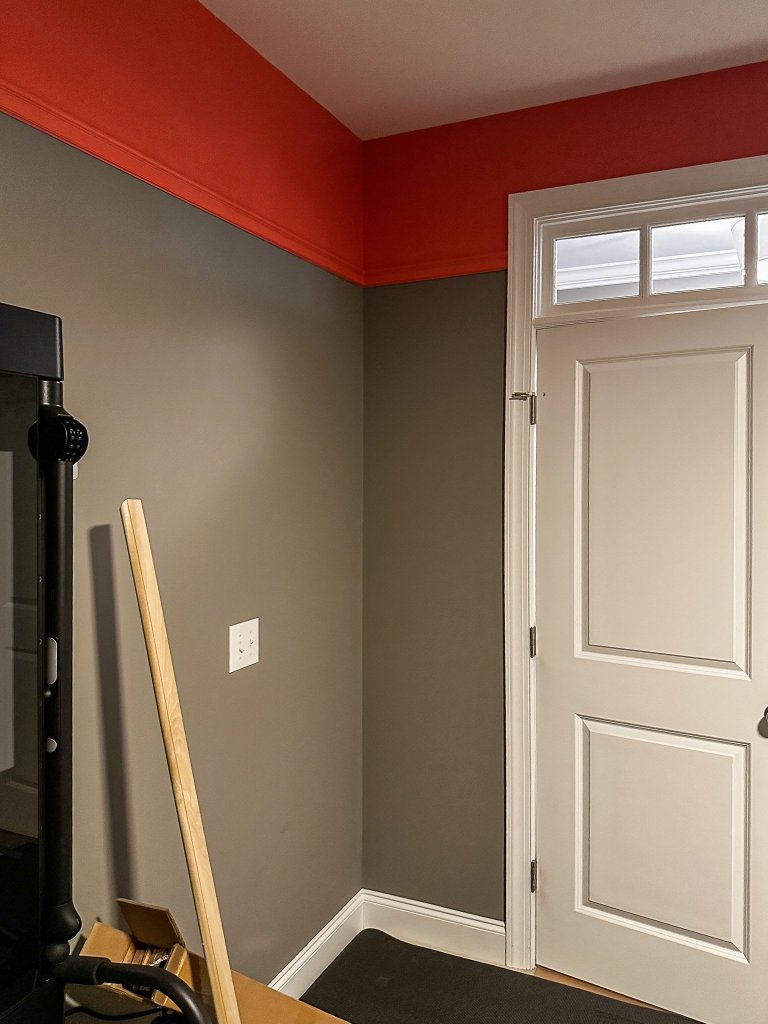 I’m not sure how easy it is to see in this picture versus when we were standing in the room with shop lights, but this is four coats of paint later. We’re not sure what happened with our initial gallon of paint, but it just was not covering. There are places where the coverage was better, like where they cut in, and on the lighter wood trim, but you can still see the gray through the coral paint after all the rounds of painting!