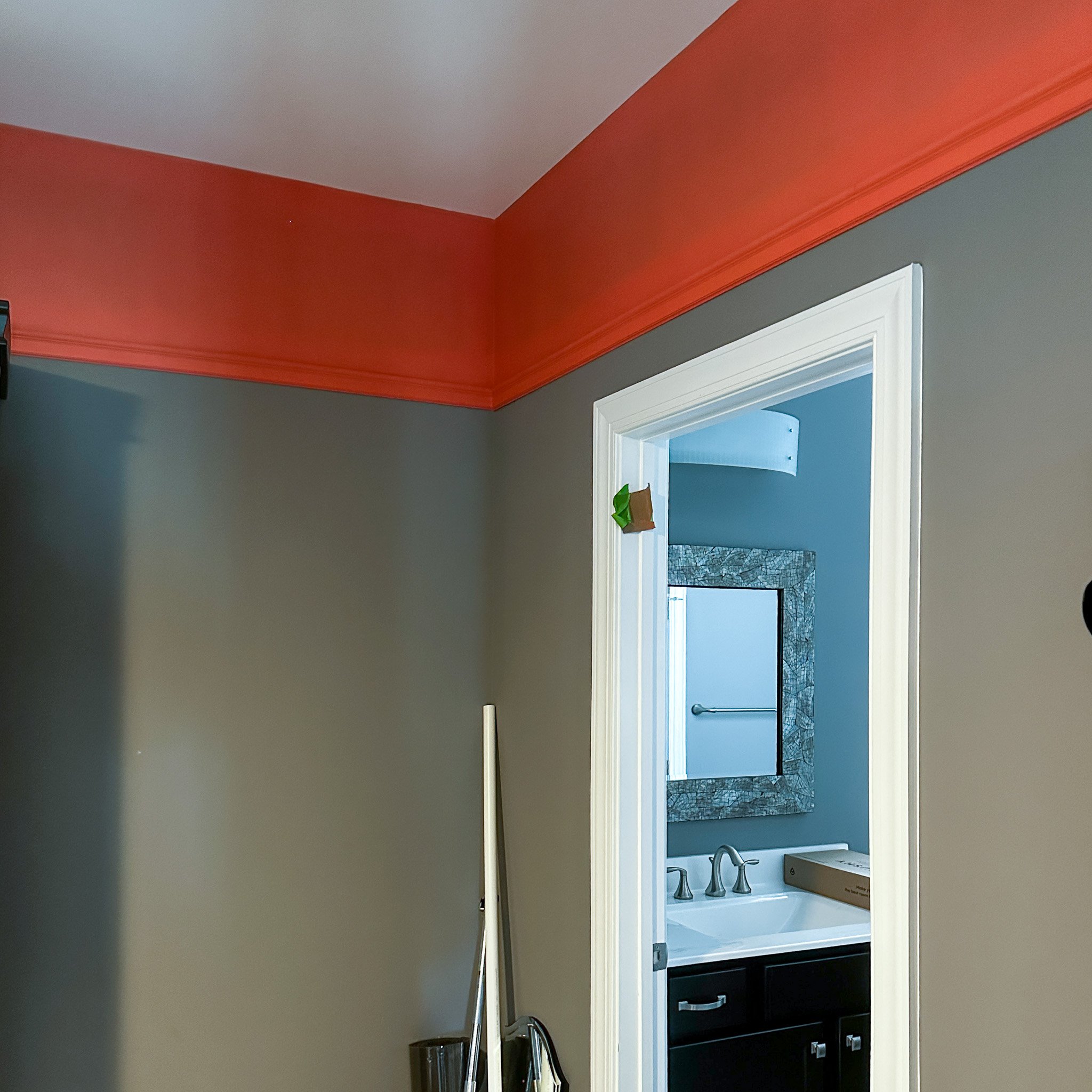 After making the call that “one more coat” probably wouldn’t cut it, we went on a late-night paint errand to get a new gallon from a different brand. So, the accent color in here is now, officially, Watermelon Slice by Behr. And wouldn’t you know it, after one coat of that the next day, we had a perfect solid finish.
