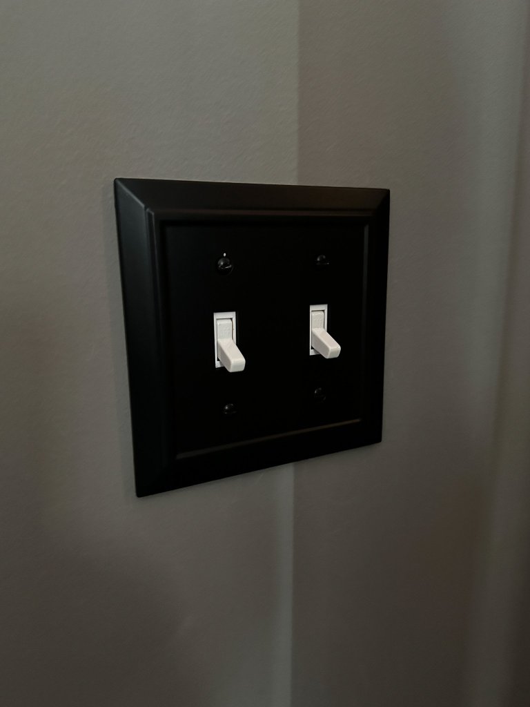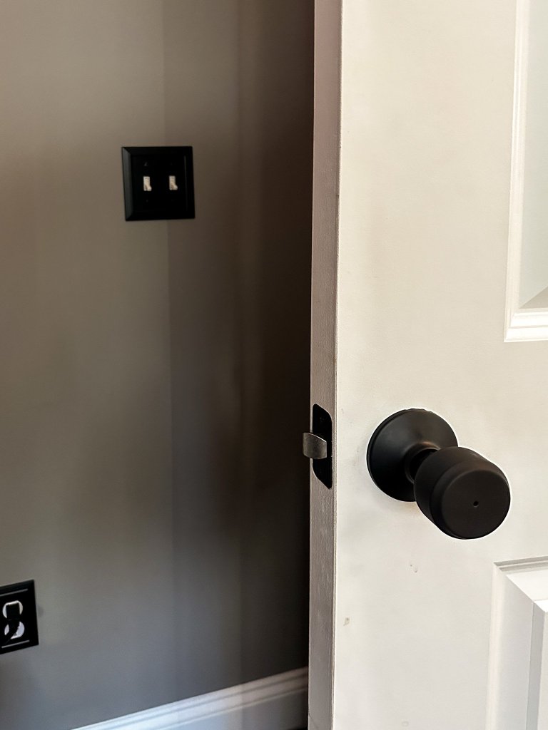 This week, we also swapped out the door knobs and wall plates. The door knobs were pretty basic brushed nickel before. Since we’ve used the Schlage Bowery line with a different trim for some nearby doors in our house, the Bowery with Plymouth trim knobs were an easy choice. I love the modern lines of the knobs, and the Plymouth trim adds a nice detail without being overpowering on the double doors. Our wall plates were previously the standard white plastic, and we replaced them with matte black wall plates from Franklin Brass in the Classic Architecture pattern. I’m working on sourcing some similar blank wall plates for the wall conduit and coax boxes from when this room used to be an office. Swapping out door and wall hardware is a really easy way to change up the look of a room!
