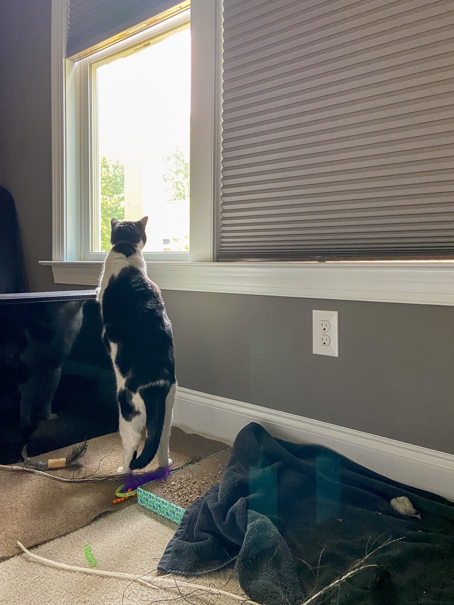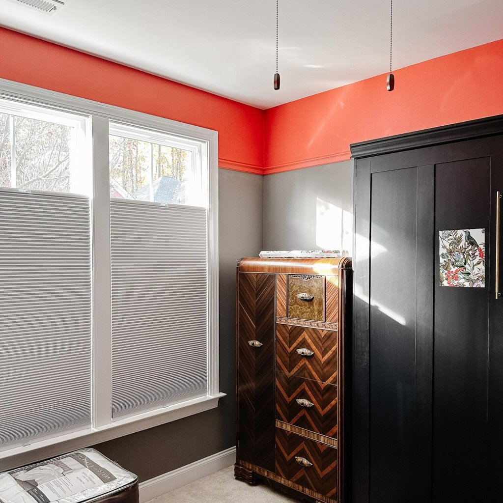 There were already blinds in the gym, like most of the rooms of the house, and they were fine. However, there were two things we thought could be better. For one, these blinds were a dark gray to match the walls, and we wanted something brighter for this space for working out before or after work. The other thing is that this room is on the front of the house on the ground floor, and we have a great walkable neighborhood… where neighbors could look right in if we had the blinds open for more light.I did a lot of shopping around for blinds, and we had to make the decision about if we wanted automated blinds or the top-down/bottom-up blinds. In the end, the ability to have a lot of natural light in the room while still keeping our privacy was our main priority. Blinds.com had a ton of great options for us to select for these blackout cellular shades. We went with a 1/2” double cell shade in Cotton, for efficiently blocking out light and heat for those North Carolina summers. It’s a big plus for us that these are cordless, too, because we want to keep cords away from Moxxi and she is usually pretty skilled at getting past defenses.