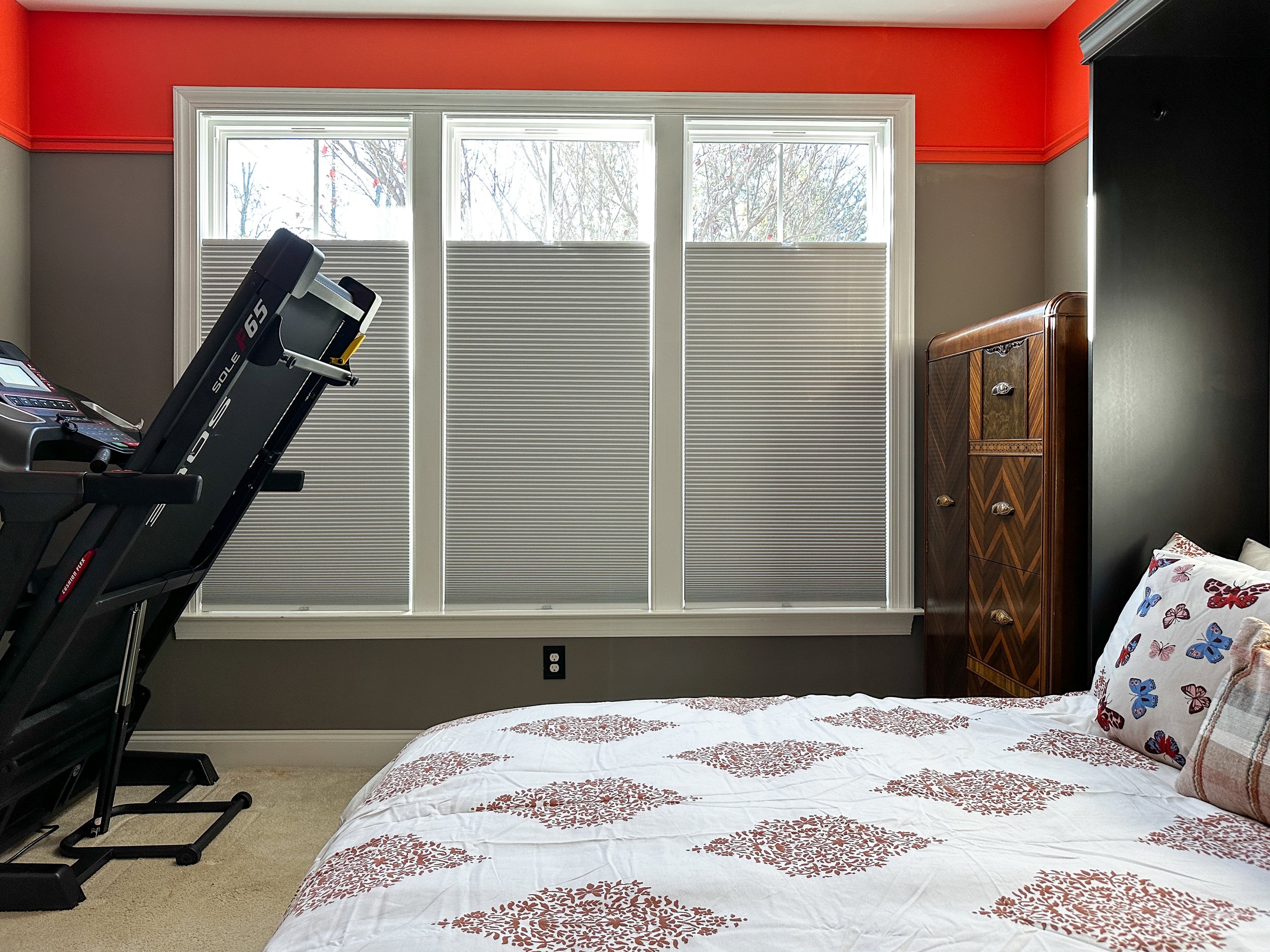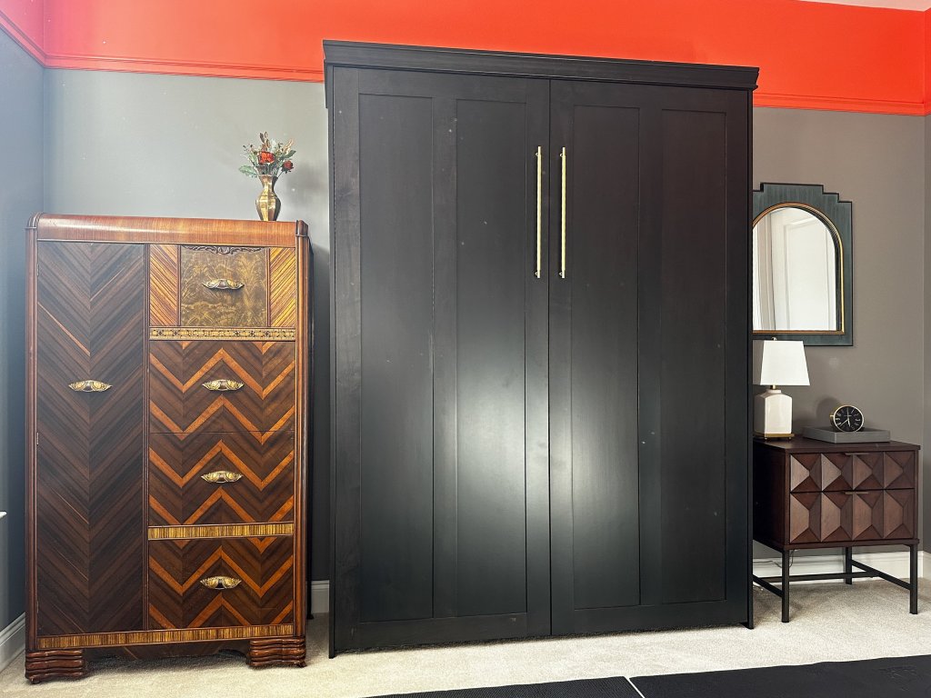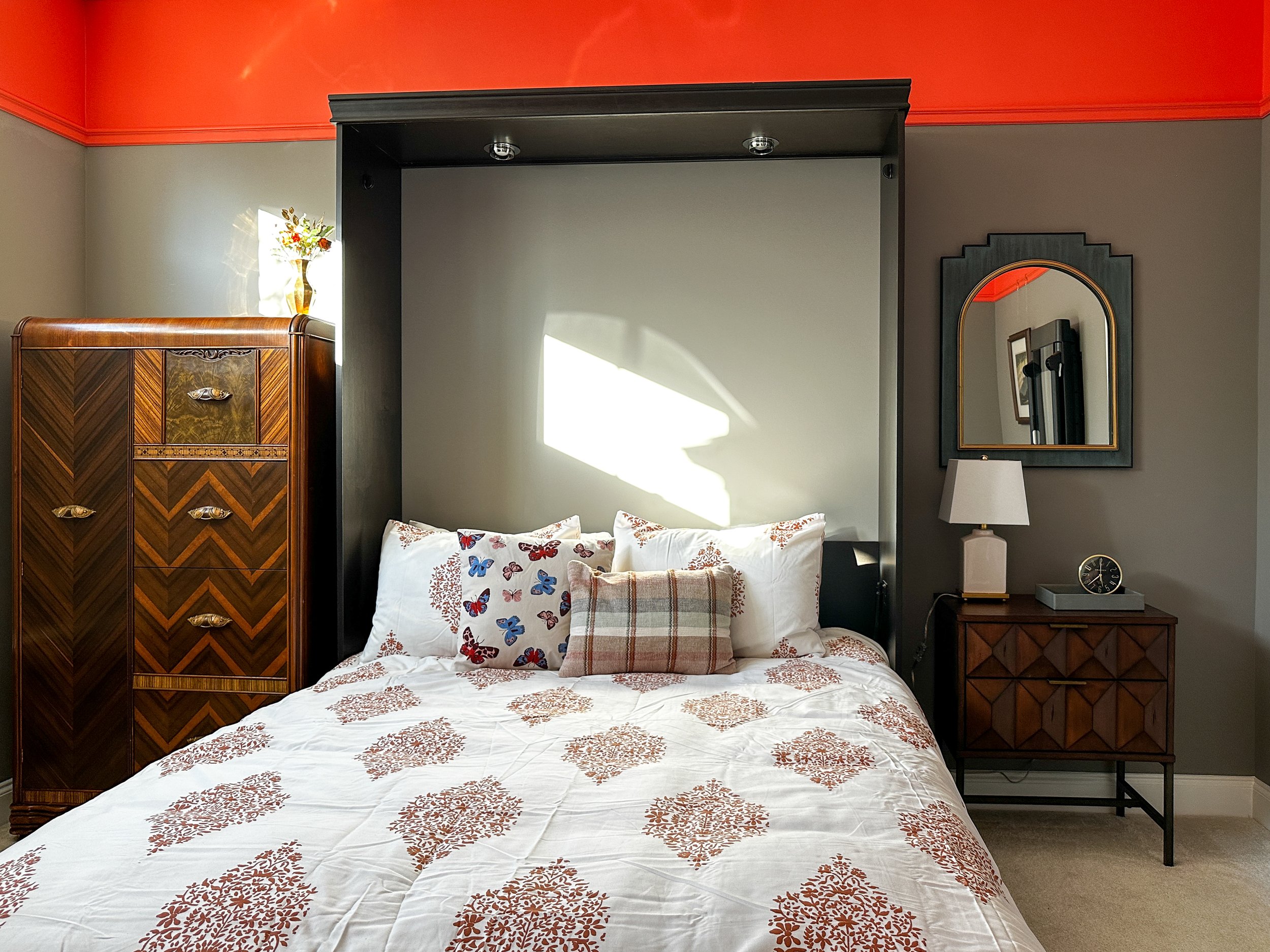 While this room will be a home gym for most of the time, we wanted it to be able to transform into a cozy guest room with Art Deco styling. By rolling up the gym mats, folding up the treadmill, and opening up the Murphy bed, we can get this space guest-ready quickly!