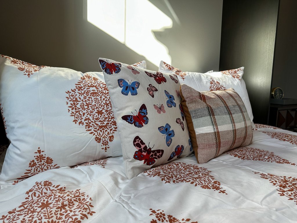 With the treadmill folded out of the way, the queen bed creates a great sleeping space without feeling cramped. We love the Helix Midnight mattress for this space because it’s very cushioning without being too thick to fold into the Murphy bed, and the Dream pillows that were a free gift with purchase are very plush as well. We rounded out the comfy bedding with a few cute throw pillows from Target that tied into the orange and blues in the room, along with a down alternative comforter tucked into this medallion duvet cover from Threshold by Target.
