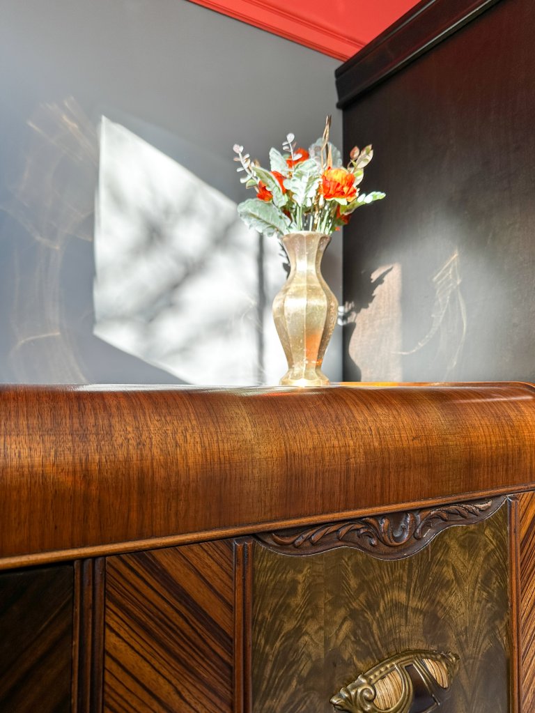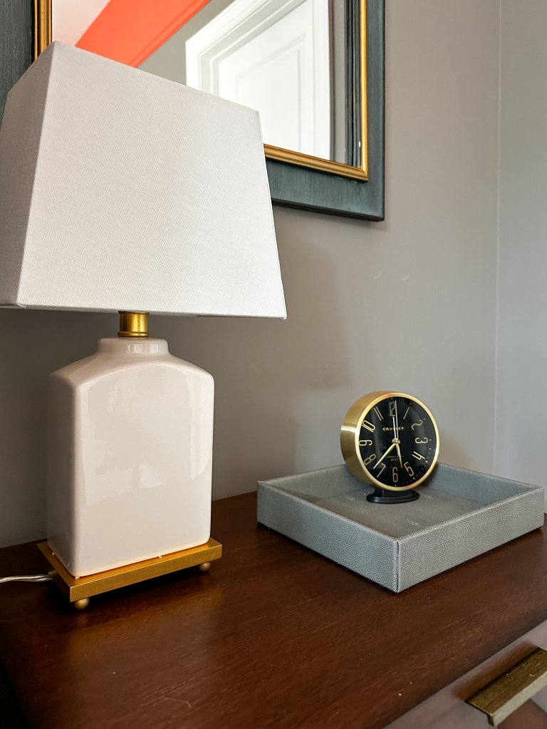 I really love the bouquet (affiliate link) I found to go into an antique brass vase – it has that burnt orange color pop and the leaves are soft green (and even gold) which feels like a very unique touch. A few more practical yet still beautiful elements were this alarm clock (affiliate link) and faux shagreen catch-all tray (affiliate link). Faux shagreen is a more environmentally friendly way to get that shagreen look that was popular in Art Deco styles, but as it’s still a pricey finish choice, picking a small element like a tray is a great option on a budget.