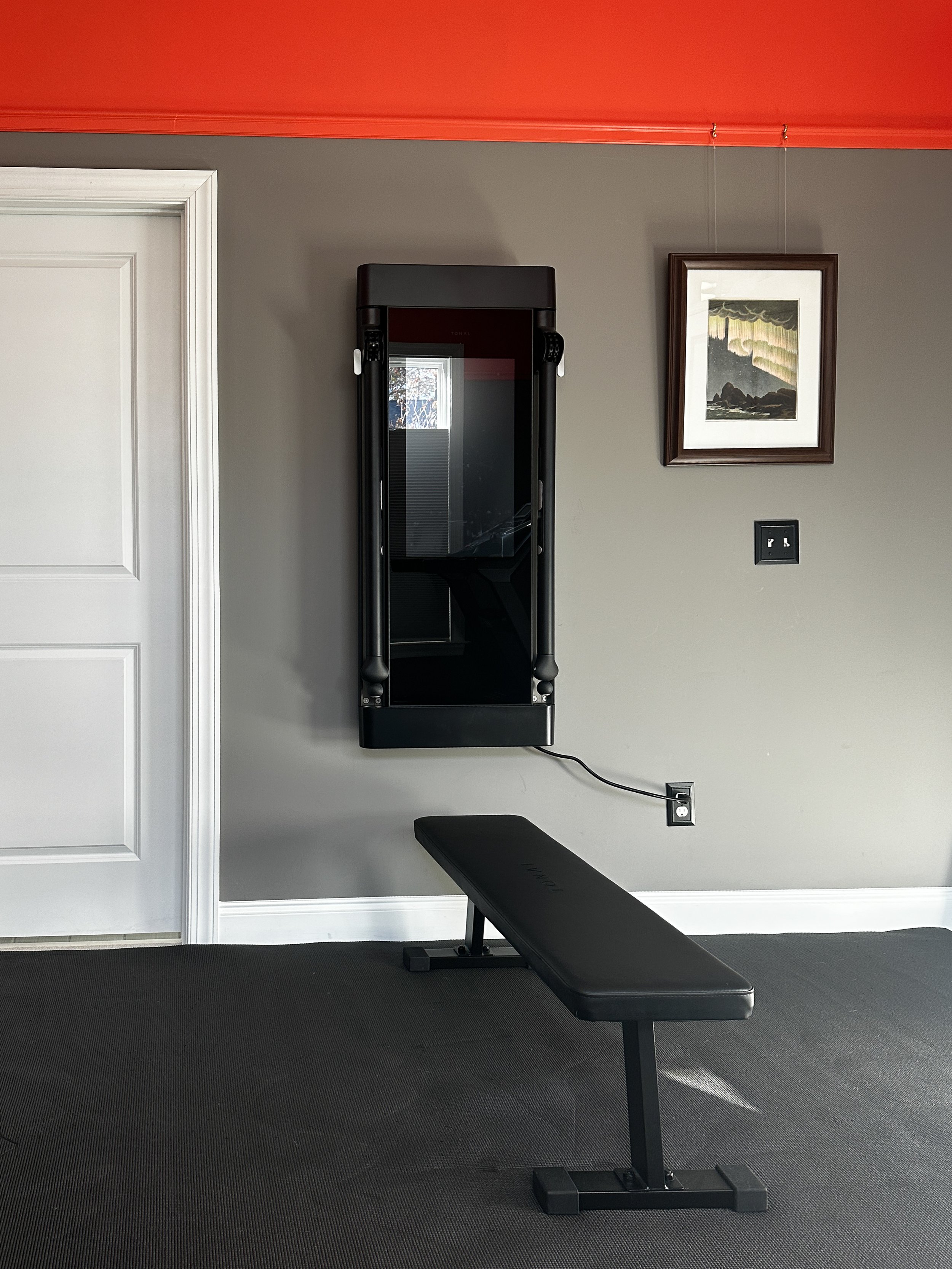 Our Tonal is set up and ready for workouts, with new switch plates and outlet covers that tie into the black metal of the workout equipment.