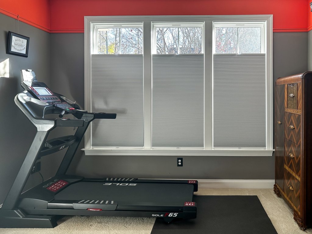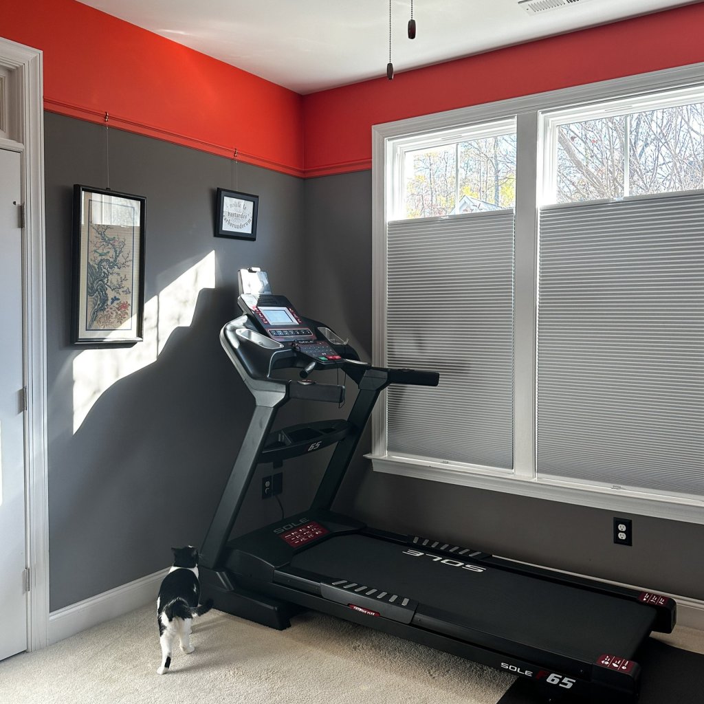 Our new picture rail means that it is super easy to add in new art, like these two pieces around our treadmill.