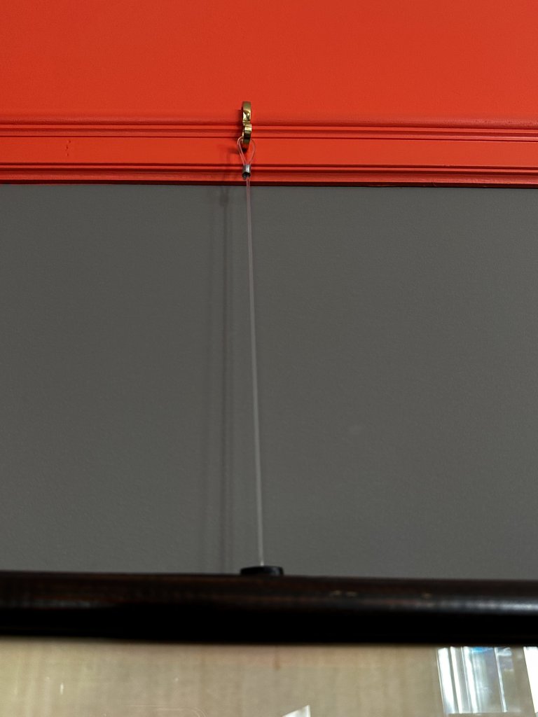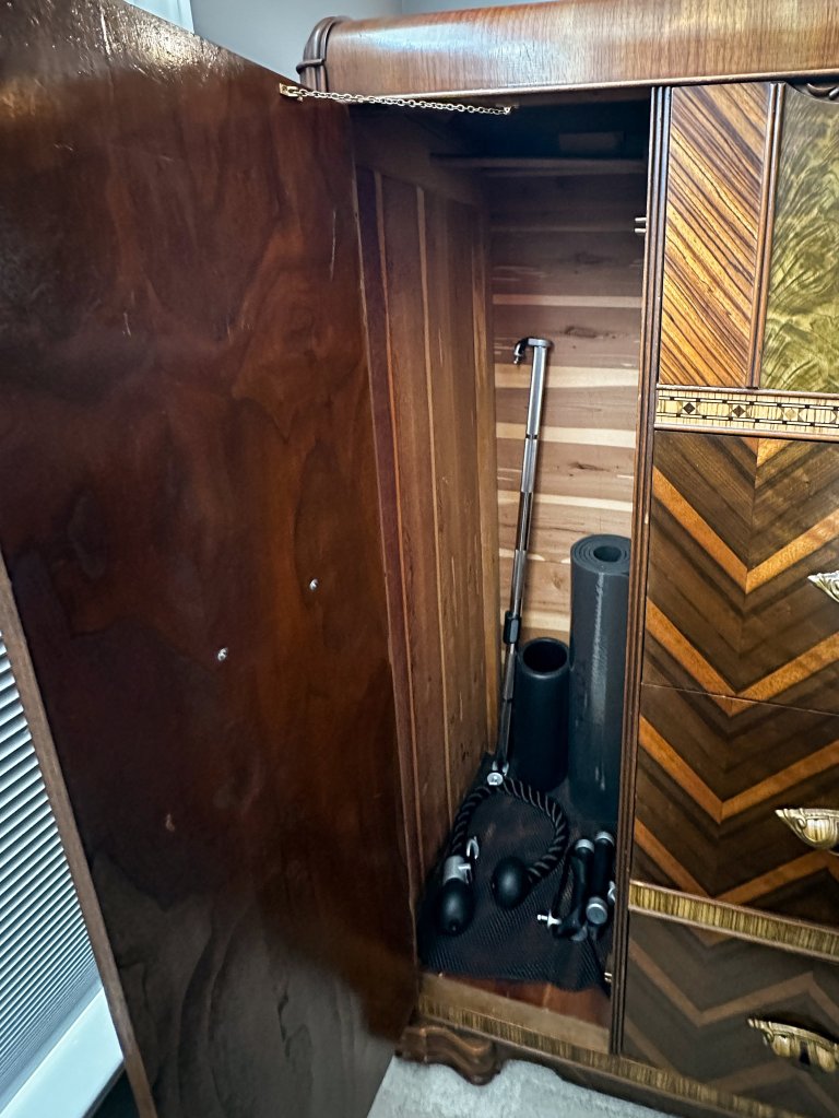 Here’s some detail shots, including the Tonal accessories stashed away in the armoire, closeups of the art and the picture hanging system we are using with the rails, and even more of that beautiful fall light coming in through the tops of our windows thanks to the Blinds.com top-down cellular shades we installed. You can even see the chain from Rockler (affiliate link) we installed to keep the armoire door from swinging open too far – it feels very consistent with the piece’s style!