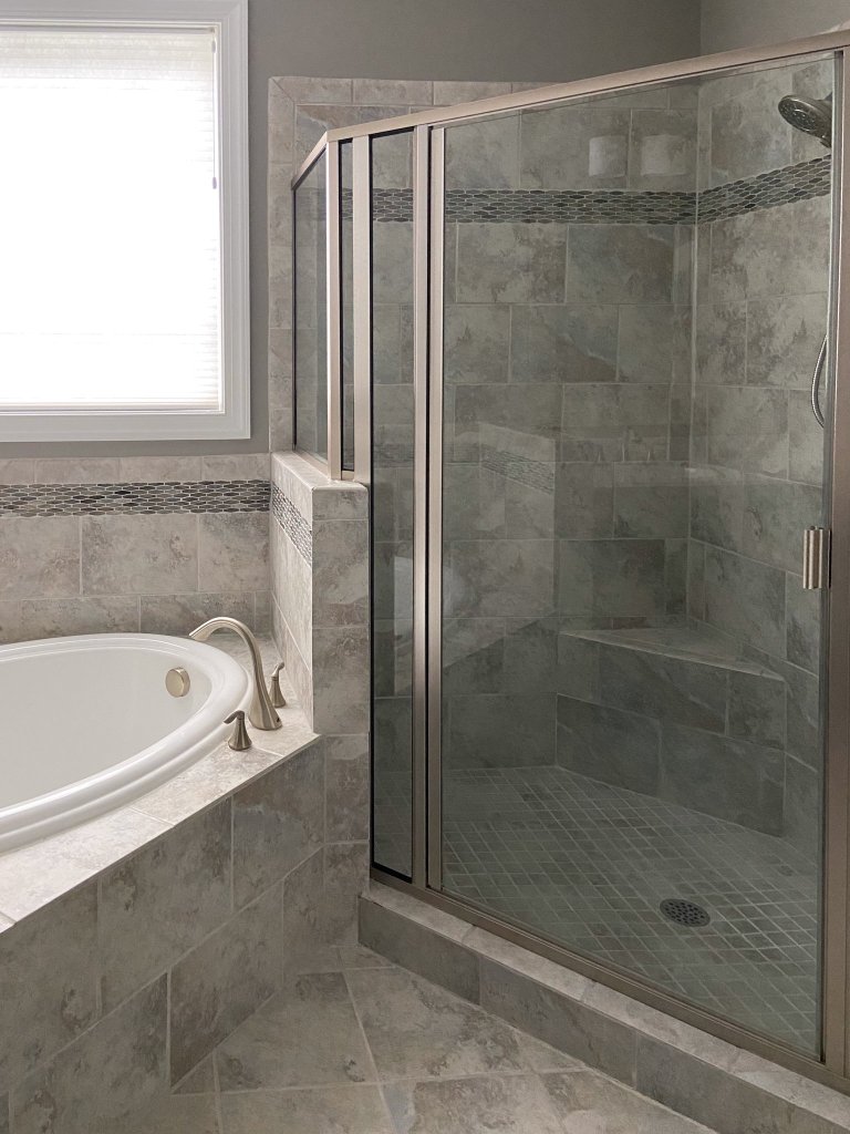 You can see above a little bit of detail tile in the tub and shower – a range of blue and brown tones in small glass tiles. That’s probably where a lot of the ideas sparked from. When doing a design, I like to identify what items are staying just as much as what’s going – it helps me pick out what updates might be saves versus splurges, and I think having a few constraints helps with my creativity. In this case, the tile was staying – close up it’s gray with some taupe mixed in, so it would match with most possible directions we’d pick, and also, it’s solid and functional, so it didn’t feel worth the cost to add all that demo and installation of new tile.
