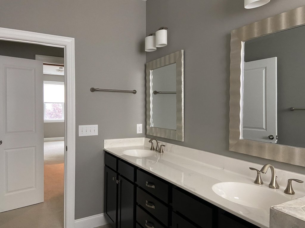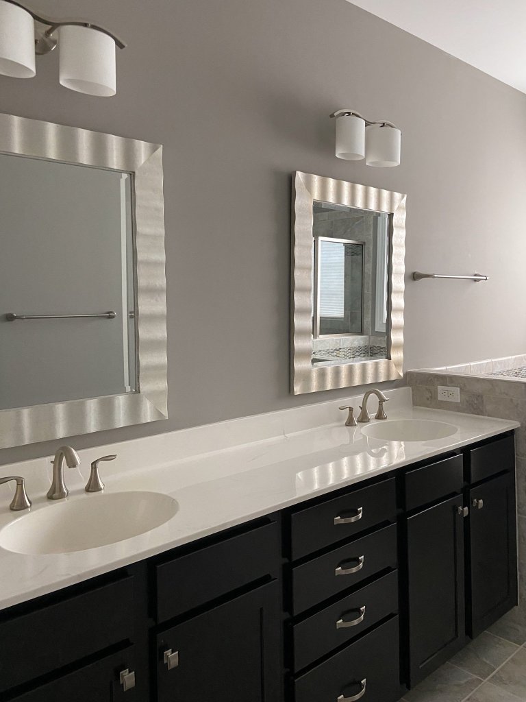 We moved into our new house in the summer of last year, and for the most part, we’ve been trying to live in the spaces for a while before doing any major updates. A big part of it was wanting to see what works and doesn’t work for our day-to-day, as well as not wanting to rush in to any major renovations. I admit to having some ideas percolating in my brain pretty early – like this bathroom wanting to be blue. The space here is great, with a big shower and a separate tub, and everything was in pretty solid working condition. It was just very gray. But again, we were waiting on updating things!