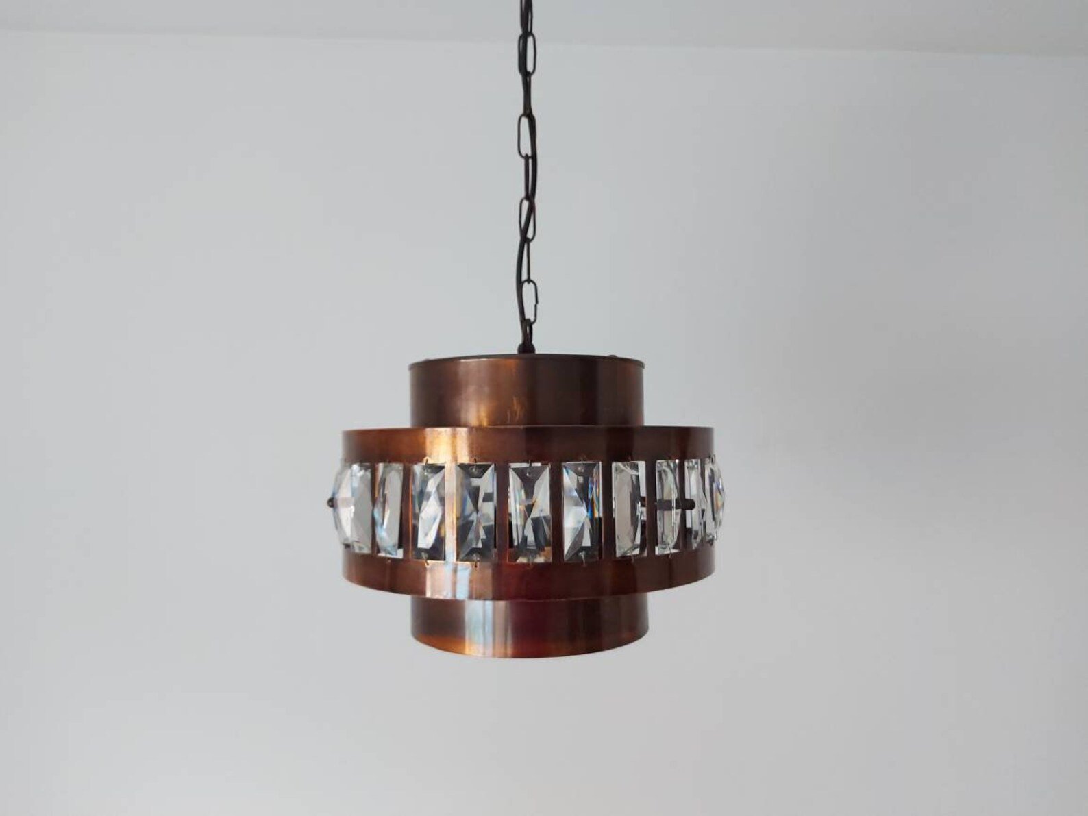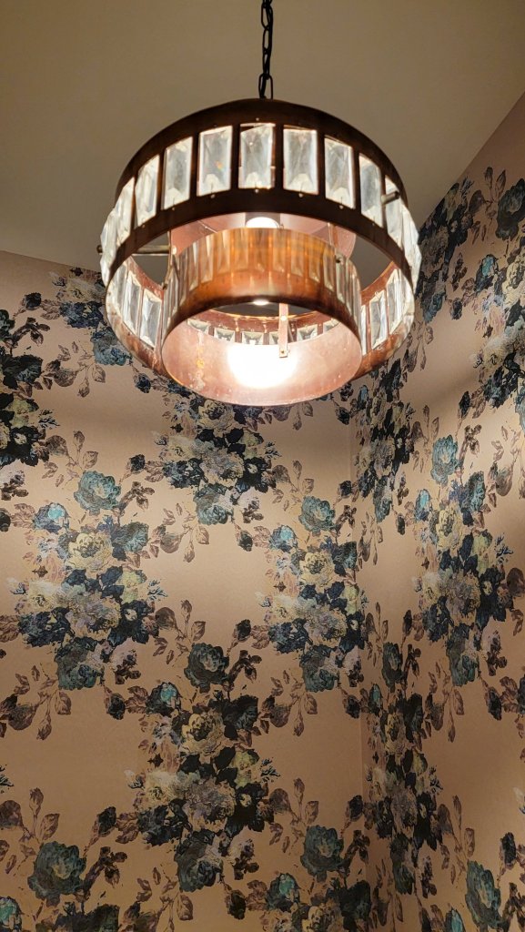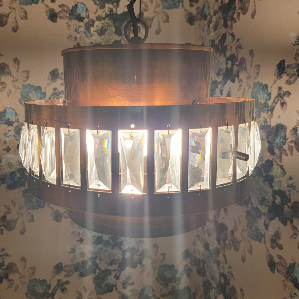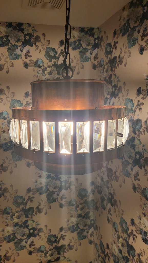 TheSpicyVintageShop on Etsy had just what I wanted, in the form of this vintage chandelier from the 1970swith copper and crystals. While it was being shipped from Slovenia, the listing specified that the wiring would work here in the US as well. It arrived quickly and was packed up really securely, and I was immediately in love with the piece!