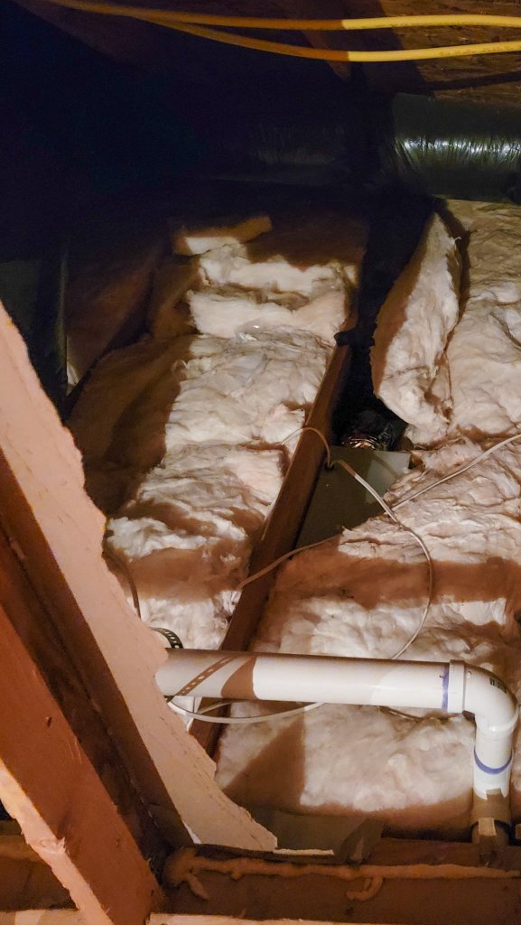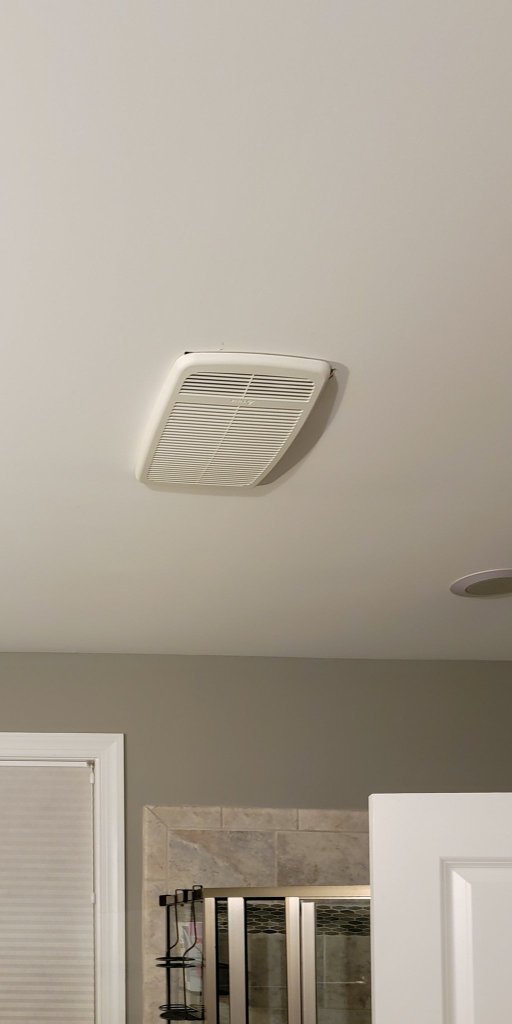 I’ll start this explanation off by saying that I am not an electrician at all, let alone a licensed one, and I definitely recommend our route of having a licensed electrician do your electrical work for projects. This is more to cover the steps involved so you know what to expect when going from a bathroom fan to one with a heater, because it is definitely more involved than changing out a light fixture. We did already have the duct in place from the existing bathroom fan, as you can see here in the attic shots. Speaking of the attic shots – the fan itself needs to be secured to an attic joist. It was good that we had attic access to do this, so we only need to repair a little drywall around the fan, but this is still something to consider because working in attics brings its own set of challenges. Finally, the heater inside the fan needs a dedicated 15 amp circuit. This was a ton of work and I’m glad we had our electrician here to do it, but I am also really excited to have a heater right outside the shower door now!
