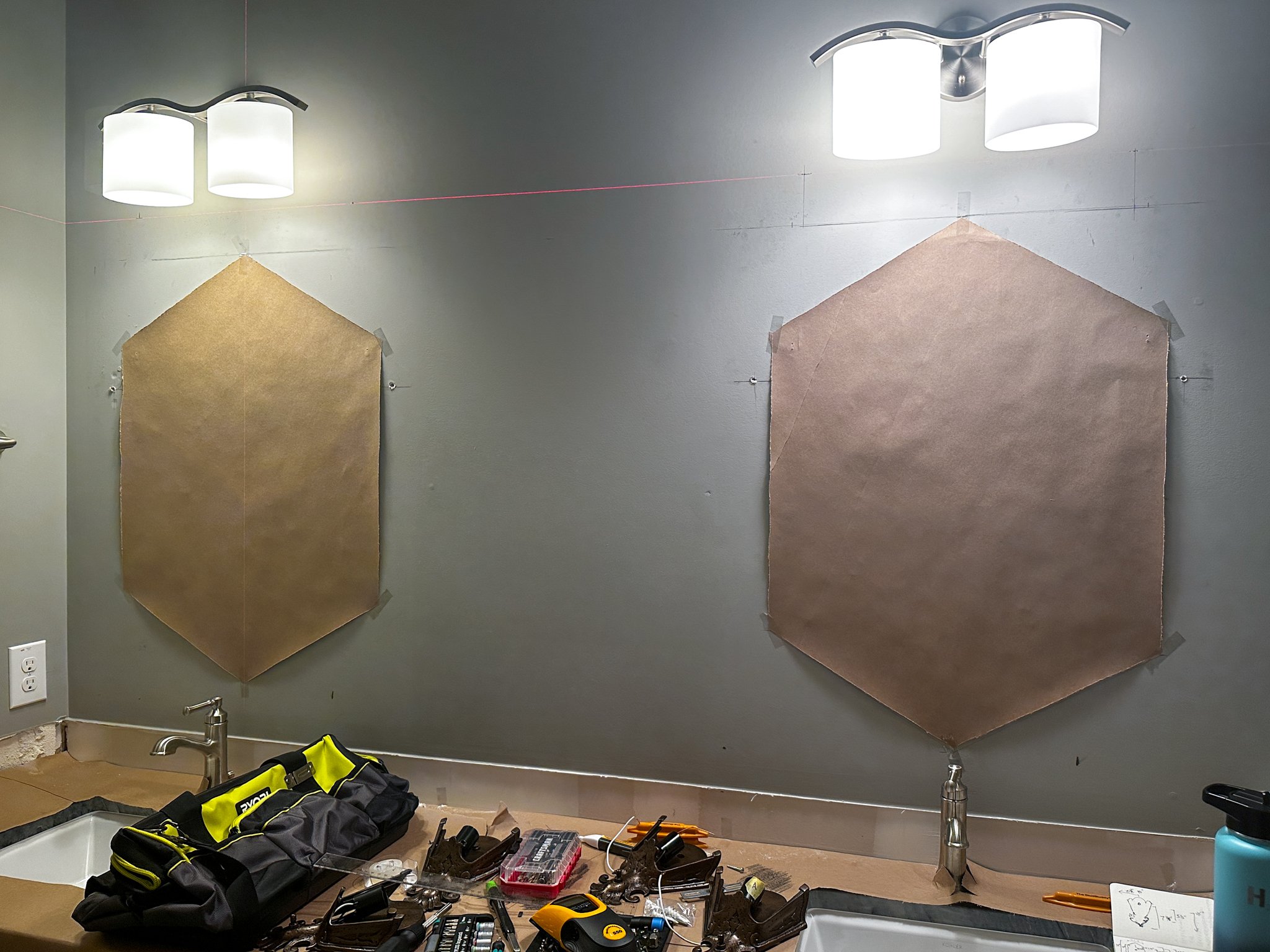 The next thing we had to do was plan out where the vanity lights were going to go, since we were moving from having one fixture above each mirror to positioning four lights, one on each side of the two mirrors. Also, since our new countertops were already in place, protecting them was a key step in getting ready for light installation! I was really glad we had this rosin paper (affiliate link) in place before the tools came out and the drywall started flying. Matt made paper patterns for laying out the mirrors on the wall, and you can also see his sketch of the light fixtures and their mounting mechanism in the bottom right corner of this shot. With his laser level, a lot of double- and triple-checking measurements, and me coming in to get the full zoomed out view, he marked where the new wall sconces would be mounted.