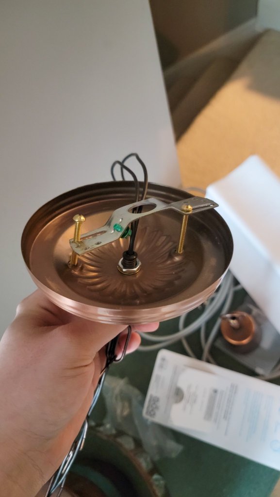 We also had a little adapting we had to do on the chandelier fixture. The wiring and chain ended in this small copper cone, which had no way to attach to the ceiling electrical box. After researching various pendant lamp attachments, I found this canopy kit from B&P Lamp (affiliate link). It came with all the hardware we needed, including a crossbar, and still had some nice detailing so it fit with the fixture’s style. Matt removed the cone and the pieces that attached it to the chain, then ran the wires through the center of the canopy and attached the chain to the matching loop. It was a pretty straightforward process, and now the light was ready to attach to the electrical box. We also added a small ceiling medallion to make sure the box was fully covered. I guess we did get to do a little of my idea about constructing light fixtures after all!