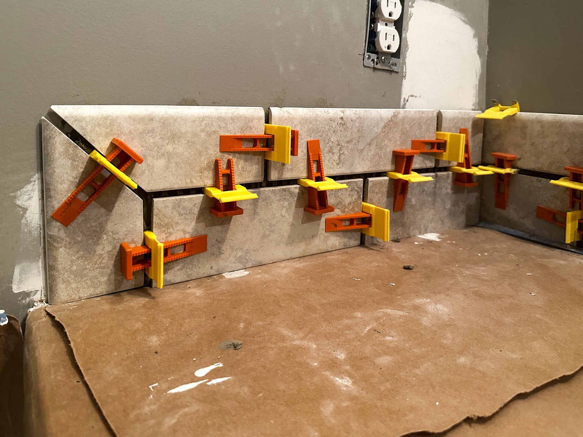 To match the existing tiling in the room, we were going with a 1/4” spacing between the tiles. We got 1/4” leveling spacers from Accufloor (affiliate link), which go along with these reusable wedges (affiliate link) to hold the tiles in place. This meant that we could assemble big portions of the backsplash to get them ready to apply to the wall with thinset.