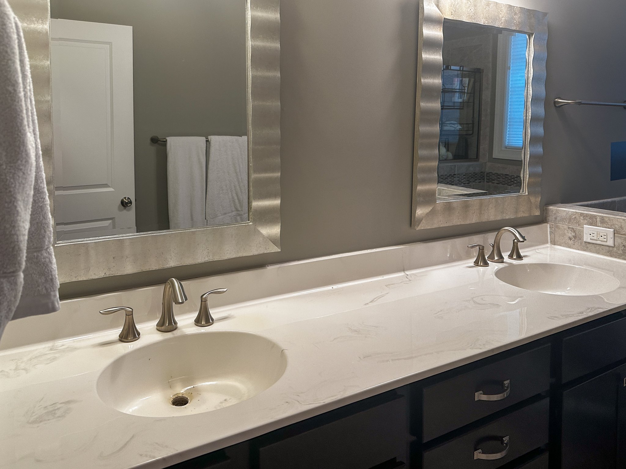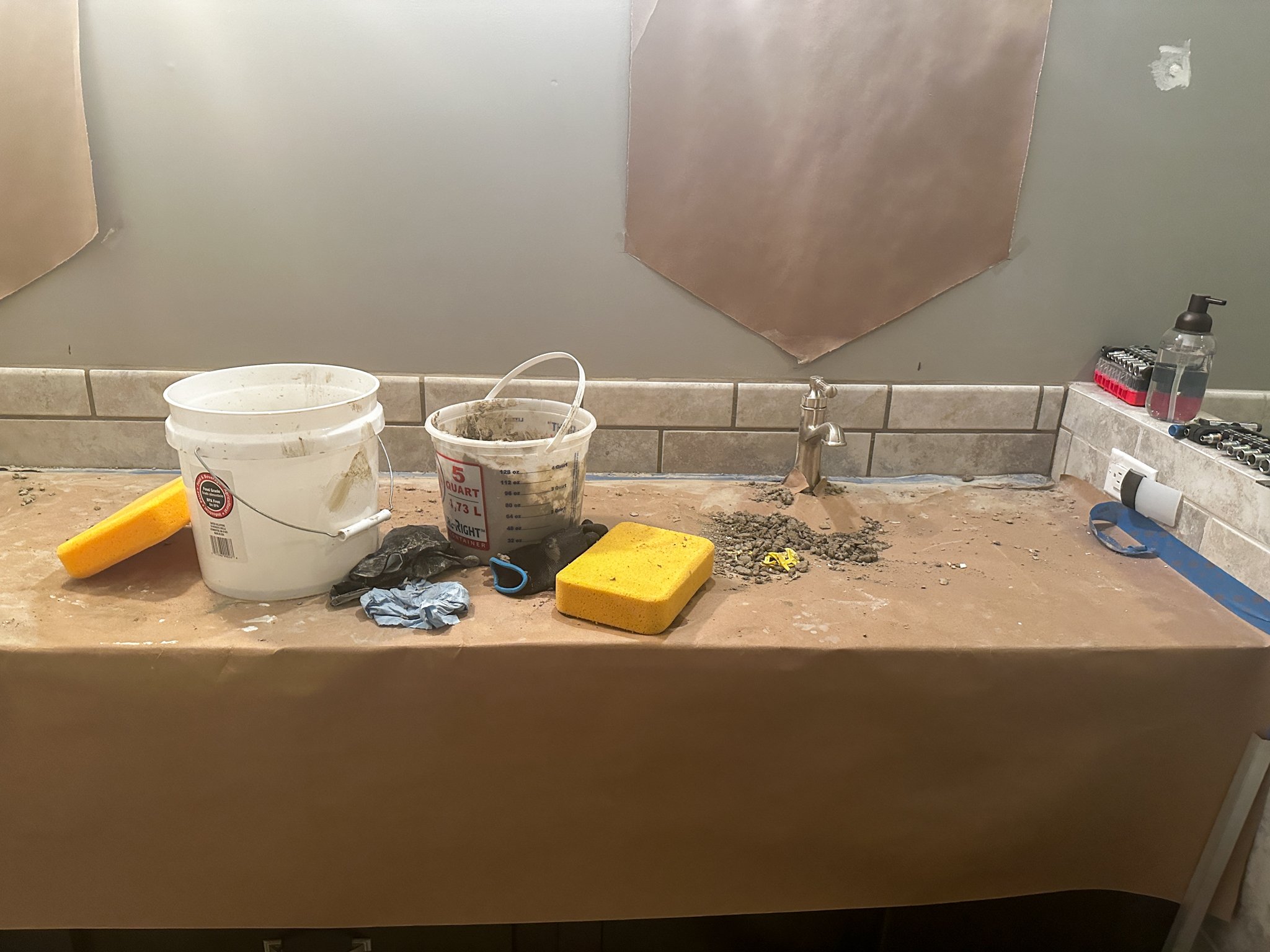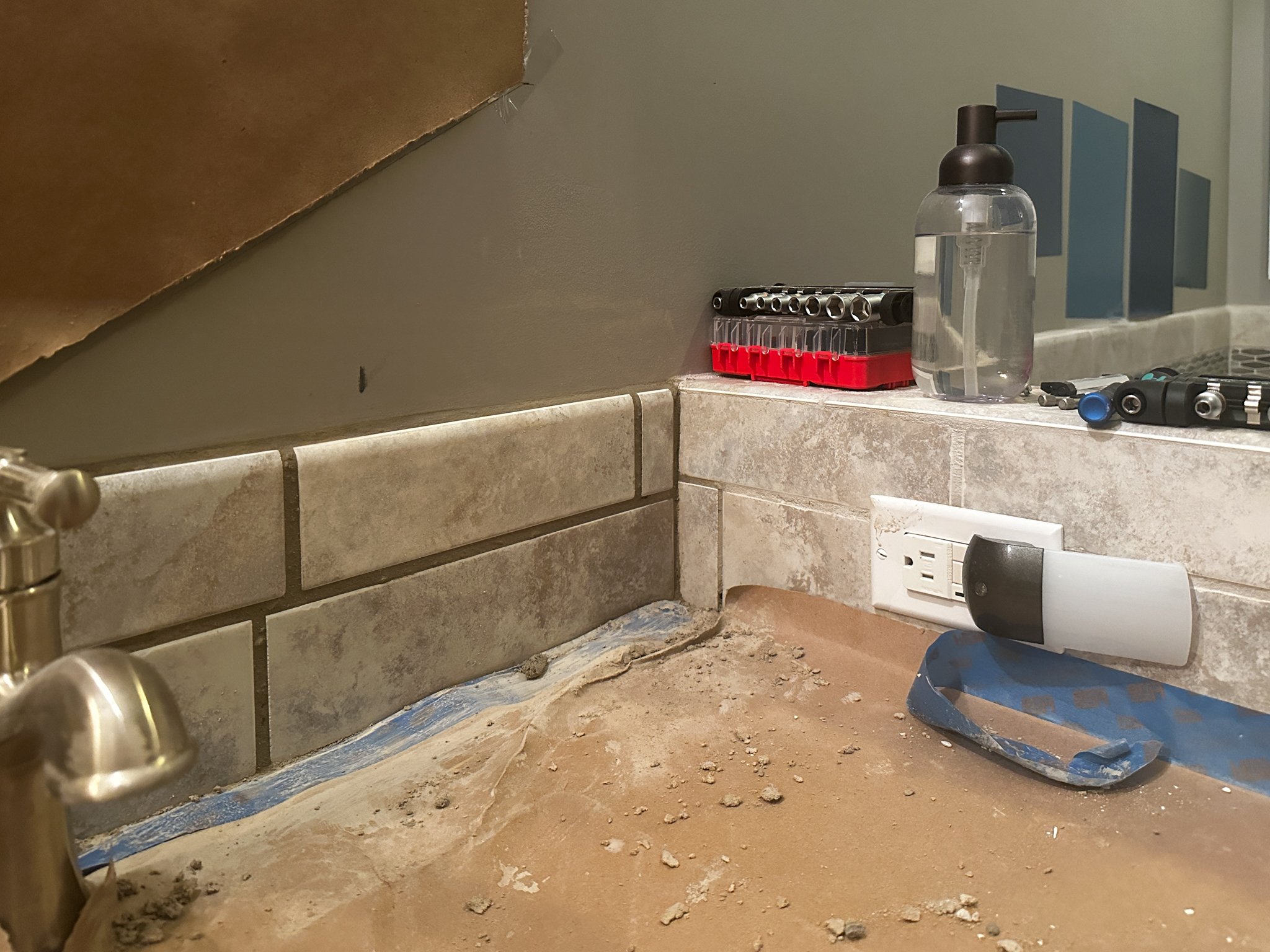 This week was all about making sure we were ready for painting, the last major part of the bathroom update. That means anything that might impact the walls or the cabinets had to be knocked out. When you’re working with a higher sheen paint (like in a bathroom), touchups are way more apparent and you often have to repaint much larger portions than you normally would for touchups. That meant this week was patching up the drywall and tiling the backsplash!