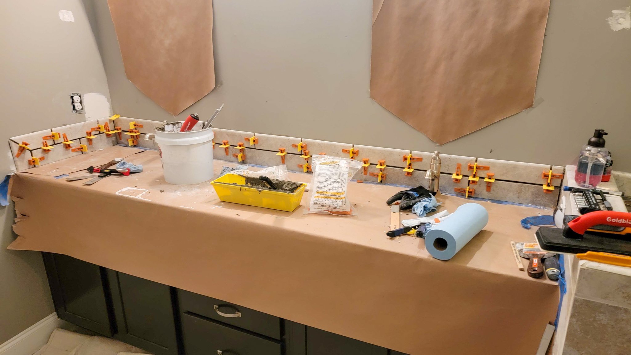 After a long evening’s work cutting tiles, laying them out with the spacers, and then attaching them to the walls with thinset mortar, the tile installation was complete! You can see now why we needed to move that outlet on the left up, and our drywall patching of the previous outlet location. Having the tile spacers made getting nice even lines with the wider 1/4” spacing much easier, and we weren’t worried about any possible vertical sagging with the thinset mortar because the wedges held the tiles very securely.