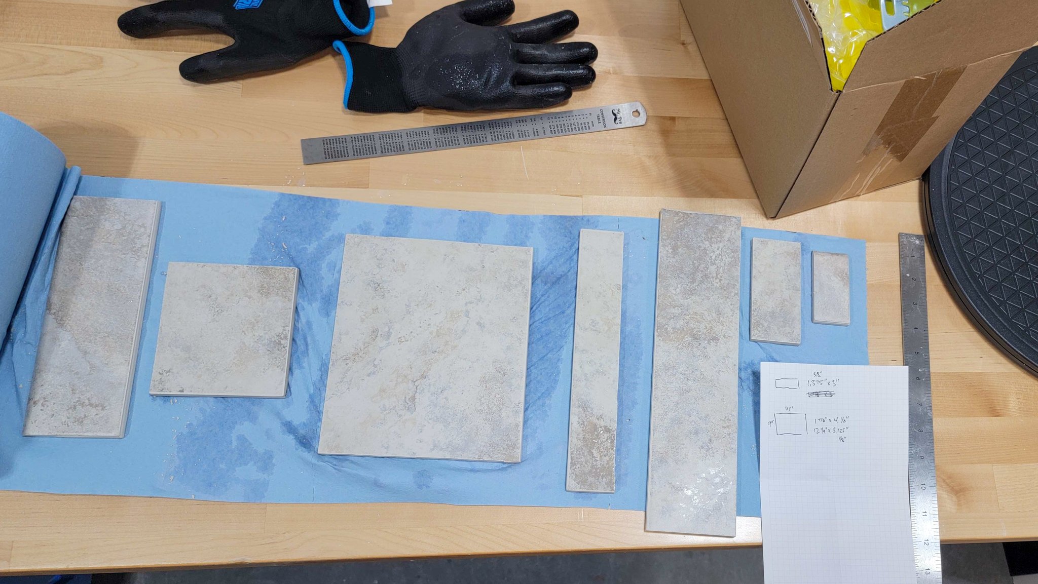 We have never tiled before – and at this point the memory of all the thinset and grout work is too fresh in our minds to know how frequently we will do it in the future – but we wanted to give it a try for this small backsplash. I’d seen Monica at House of Esperanza use the Ryobi tile saw on projects, and her videos of using it made it seem like a pretty approachable way to cut tile. We actually were able to find it with the stand for around the same price as without the stand at Home Depot. Matt made a diagram of all the cuts we would need, and started doing test cuts to make sure we would get just the right measurements.
