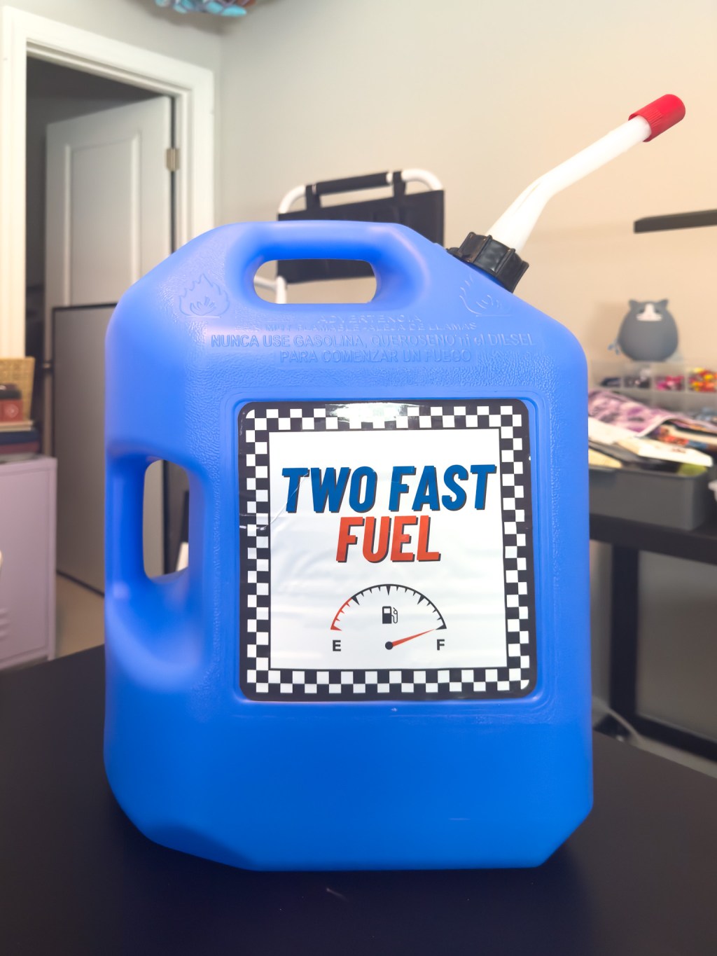 When looking for racecar birthday party inspiration, we found a lot of pictures of gas cans as showstopper décor pieces. We are going to use a water jerry can but give it a decal that looks ready for the racetrack.