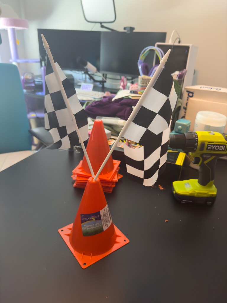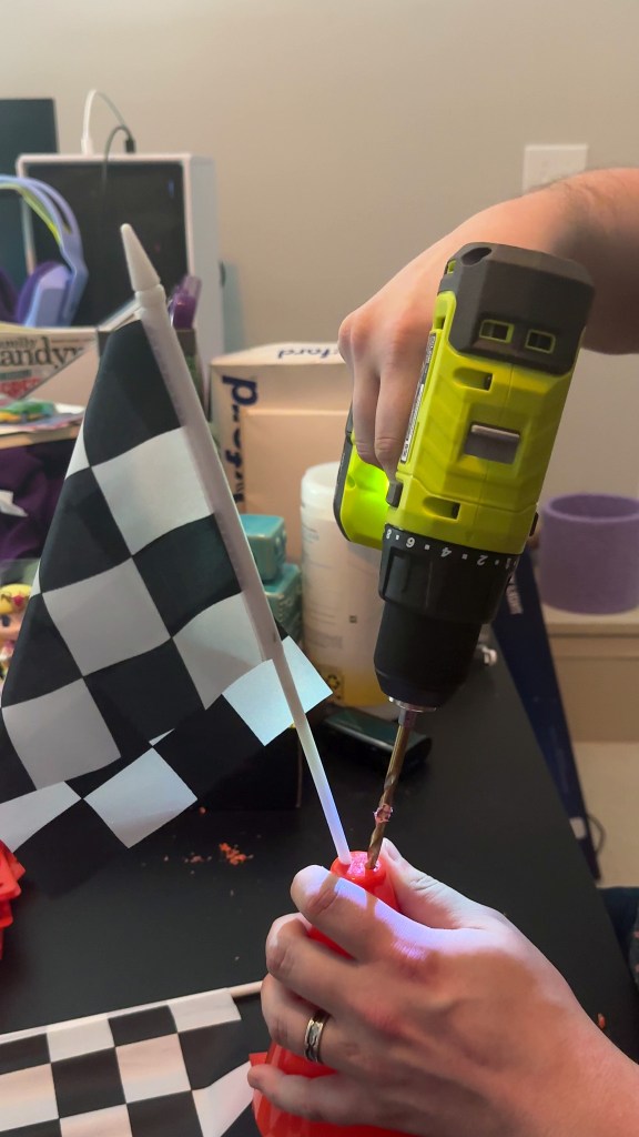 We’ll be drilling holes into plastic cones to hold racing flags for table decorations.