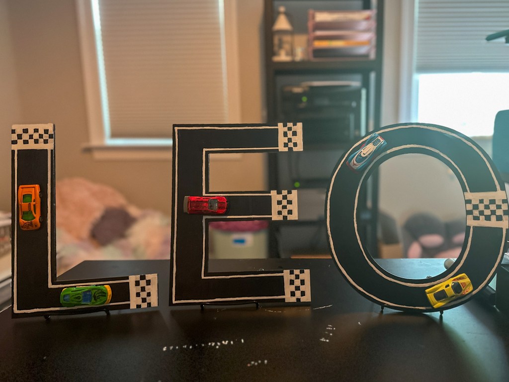 Our final DIY is a sign with the birthday boy’s name, designed to look like a racetrack complete with cars.